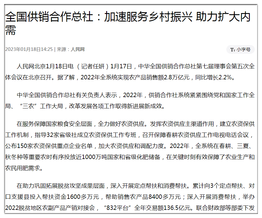 1月17日,中華全國供銷合作總社第七屆理事會第五次全體會議在北京召開。據(jù)了解,2022年全系統(tǒng)實現(xiàn)農(nóng)產(chǎn)品銷售額2.8萬億元,同比增長2.2%。