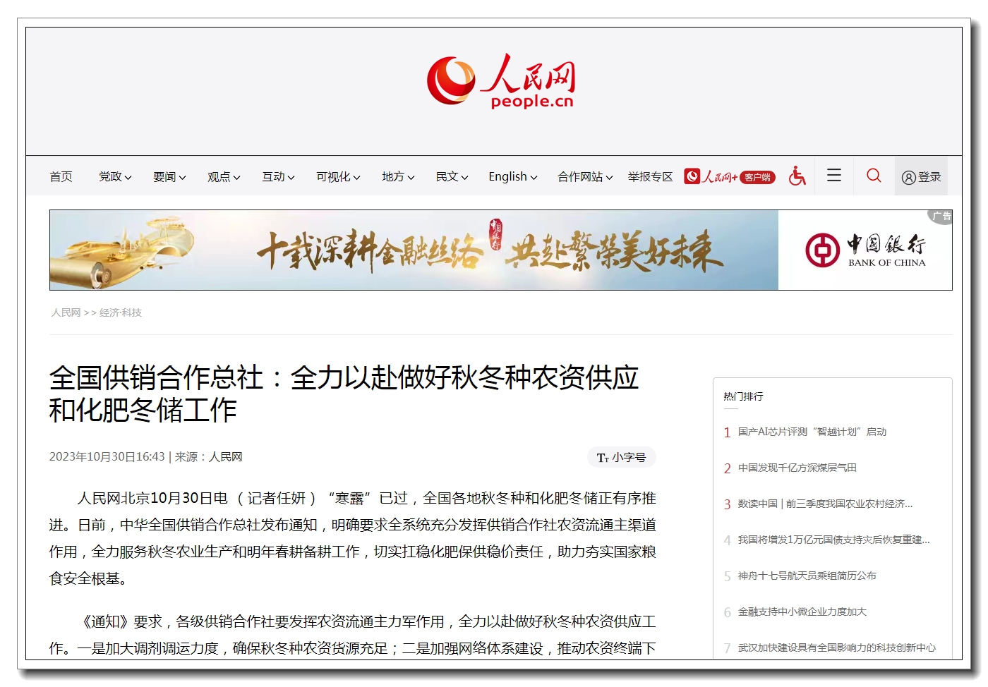 “寒露”已過,全國各地秋冬種和化肥冬儲正有序推進。日前,中華全國供銷合作總社發(fā)布通知,明確要求全系統(tǒng)充分發(fā)揮供銷合作社農(nóng)資流通主渠道作用,全力服務(wù)秋冬農(nóng)業(yè)生產(chǎn)和明年春耕備耕工作,切實扛穩(wěn)化肥保供穩(wěn)價責任,助力夯實國家糧食安全根基。