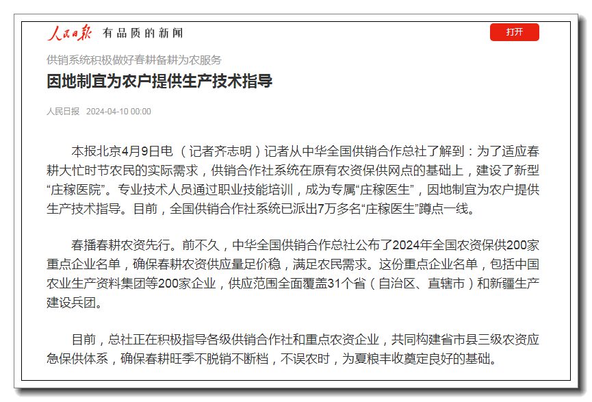 記者從中華全國供銷合作總社了解到:為了適應(yīng)春耕大忙時(shí)節(jié)農(nóng)民的實(shí)際需求,供銷合作社系統(tǒng)在原有農(nóng)資保供網(wǎng)點(diǎn)的基礎(chǔ)上,建設(shè)了新型“莊稼醫(yī)院”。專業(yè)技術(shù)人員通過職業(yè)技能培訓(xùn),成為專屬“莊稼醫(yī)生”,因地制宜為農(nóng)戶提供生產(chǎn)技術(shù)指導(dǎo)。目前,全國供銷合作社系統(tǒng)已派出7萬多名“莊稼醫(yī)生”蹲點(diǎn)一線。